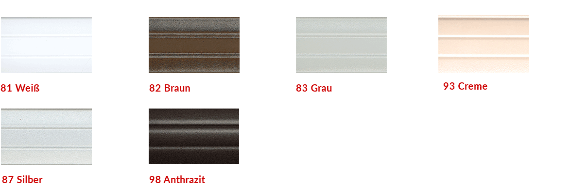 Sie haben die Wahl zwischen fünf verschiedenen Panzerfarben. Die Farbpalette umfasst sowohl Weiß als auch Creme. Gleichfalls sind die Farben Silber, Grau, Braun und Anthrazit erhältlich. Für den Kasten hingegen haben Sie Wahl aus über 650 Farben ohne Aufpreis. Sollte Ihnen diese Auswahl allerdings nicht genügen, erhalten Sie jede andere Farbe als Option.