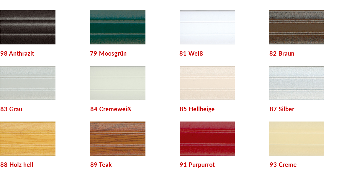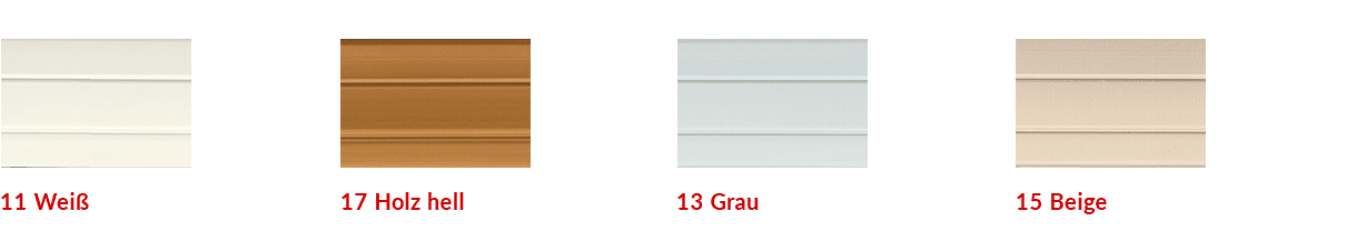 Wenn Sie den Combo IR mit einem Behang aus Kunststoff wählen, stehen Ihnen vier Farben zur Verfügung. Bei einem Behang aus Aluminium sind es 12. Kunststoffoberflächen sind in Weiß ausgeführt. Für alle weiteren Teile aus Aluminium haben Sie die Wahl aus 650 Farben - ohne Mehrpreis.